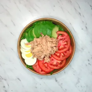 Lechuga orgánica, huevo, palta, tomate y trozos de atún. 361 calorías.